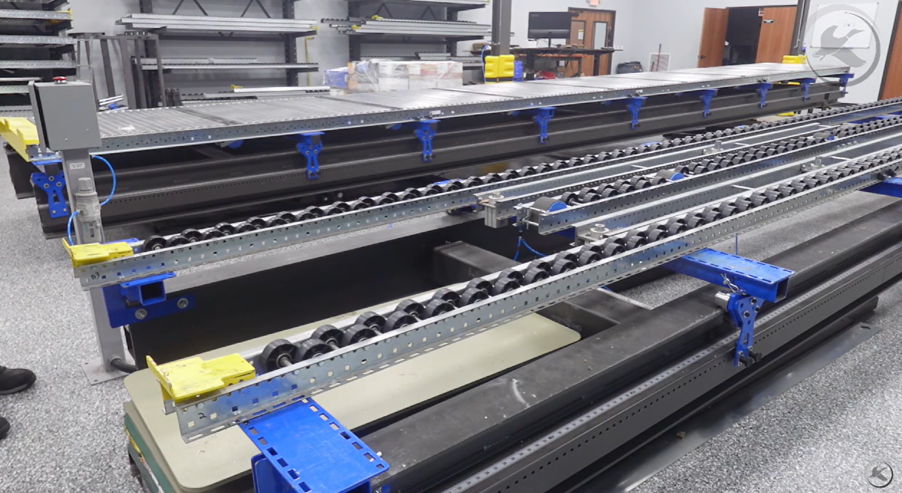 - Pallets are loaded into the flow lane, which features two full-length outer Magnum Wheel rails and a shorter center rail to accommodate the lift table at the discharge end.
